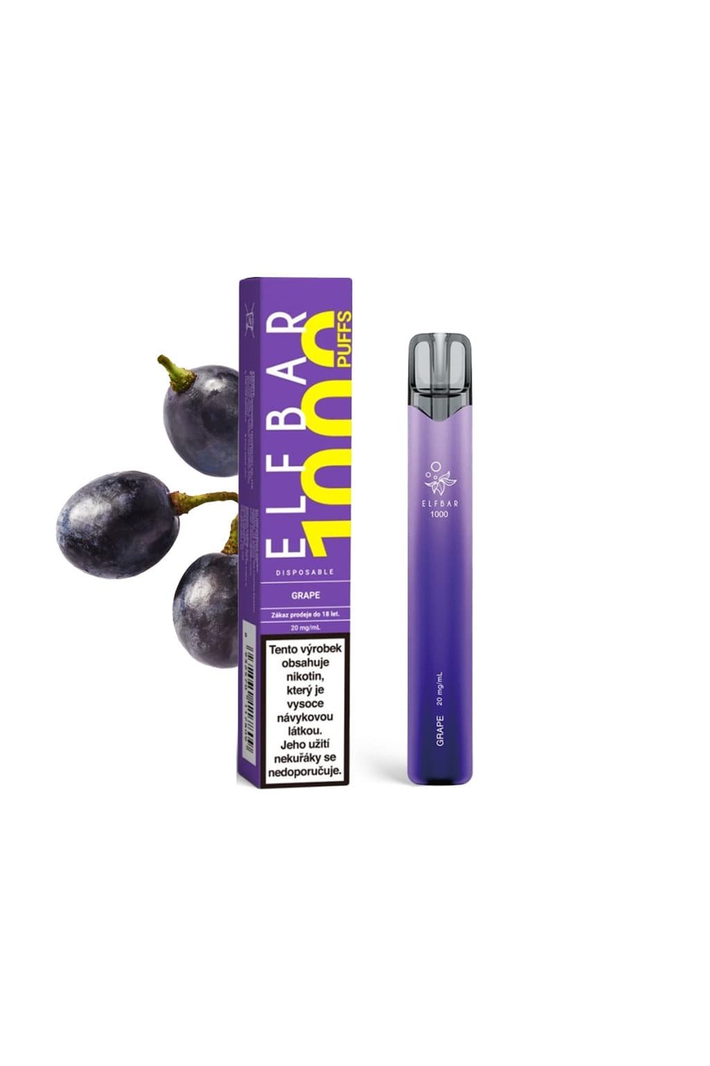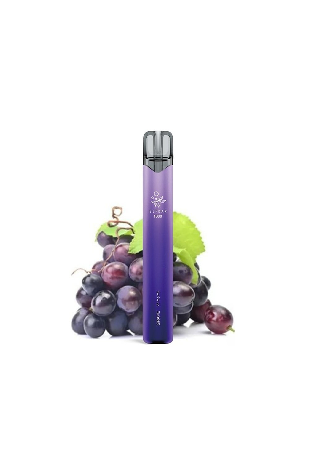 Jednorázová e-cigareta Elf Bar 1000 Grape – Vylepšená jednorázová e-cigareta se sladkou a šťavnatou chutí hroznového vína. Nový model nabízí průhlednou cartridge pro kontrolu e-liquidu a tlačítko, které aktivuje TURBO režim pro maximální tvorbu páry. Díky baterii 550 mAh a nové Mesh spirálce QUAQ vydrží až 1000 potahů a poskytuje znatelně výraznější a kvalitnější chuťový zážitek.