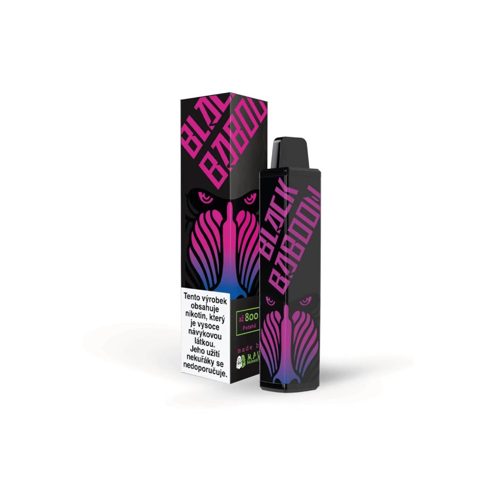 Jednorázové e-cigarety BLACK BABOON přináší na trh unikátně vypadající e-cigarety se zajímavou nabídkou chutí. E-cigareta s originálním designem je naplněna 2ml e-liquidu s obsahem 16 mg/ml nikotinové soli a nabídne tak až 800 potáhnutí. Nabídka příchutí obsahuje zejména ovocné speciality. Příchutě jsou perfektně zpracované, výrazné a také stabilní. To znamená, že křivka chuťového podání je takřka vodorovná po celou dobu životnosti e-cigarety.