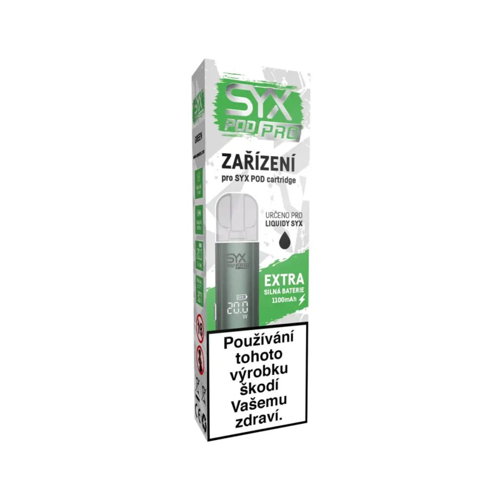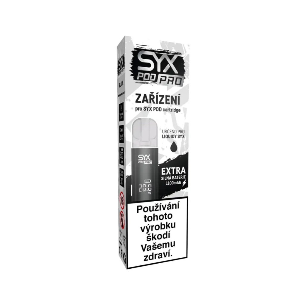 Elektronická cigareta – kompatibilní s předplněnými i plnitelnými pody SYX, nastavitelný výkon, nastavitelný Air Flow (průtok vzduchu), displej (výkon, baterie, počítadlo potahů), baterie 1100 mAh, dobíjení USB-C