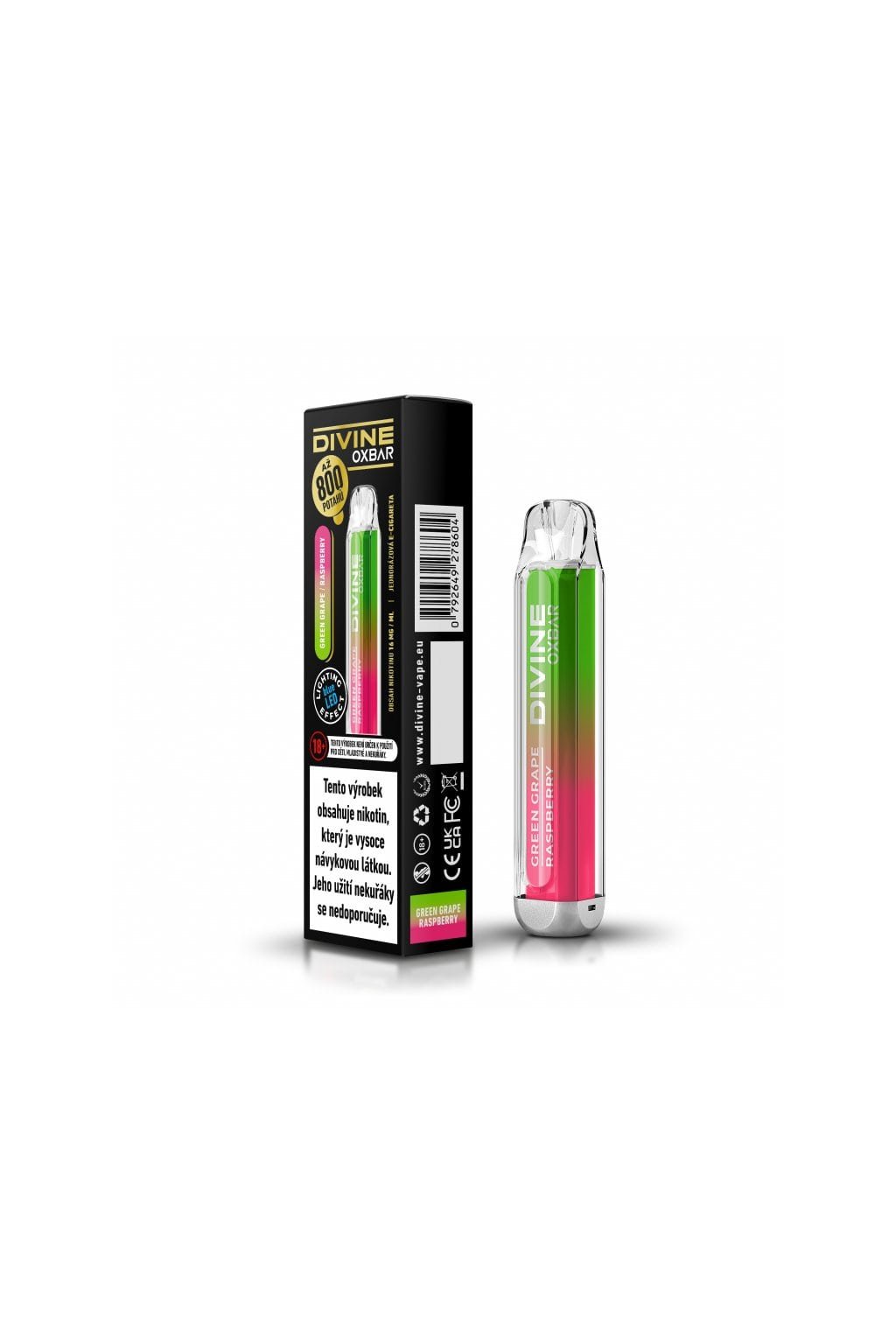 Jednorázová e-cigareta OXBAR DIVINE C800 Green Grape Raspberry s velmi zajímavou kombinací chutí bílých hroznů se sladkou malinou. OXBAR C800 nabízí velkou výdrž až 800 potáhnutí a skvěle zpracované krystalické tělo, které podporuje led podsvícení. Náplň obsahuje nikotinovou sůl, která se stará o jemné potáhnutí bez dráždivého pocitu v krku. Obsah nikotinové soli je 16 mg/ml, tedy je síla o něco nižší, než je u jednorázových e-cigaret zvykem.