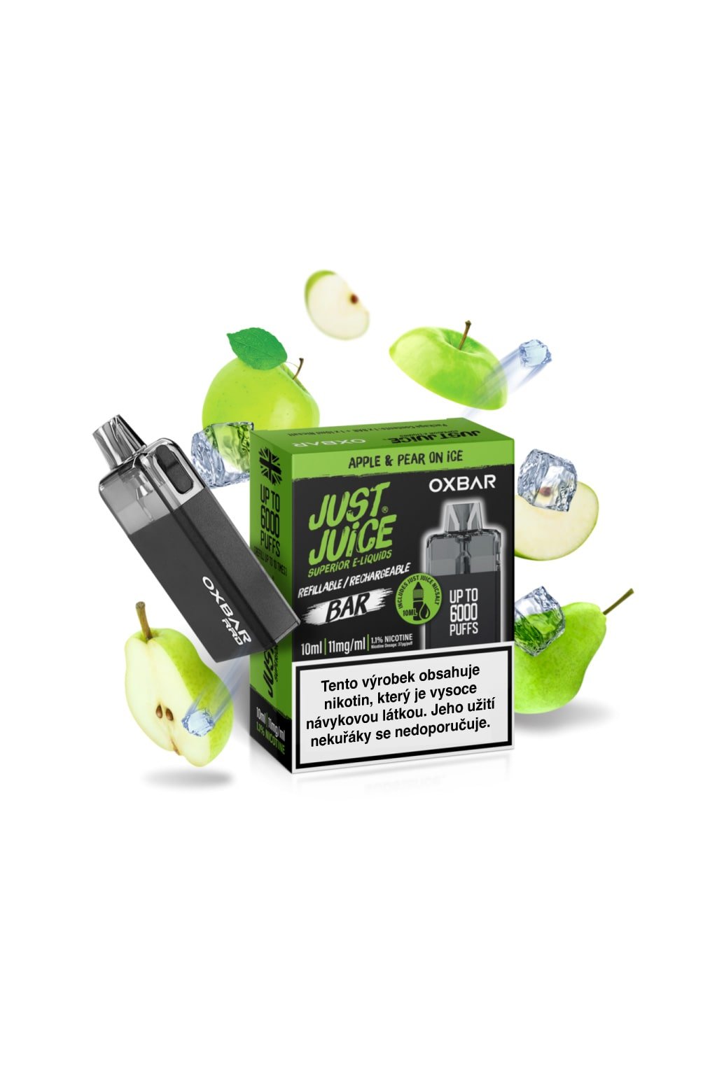 E-cigareta OXBAR RRD je v balení společně s jednou z nejoblíbenějších příchutí značky Just Juice. Jedná se o e-liquid s nikotinovou solí s obsahem nikotinu 11 mg/ml a příchutí ledového mixu kyselých jablek a krémových hrušek.